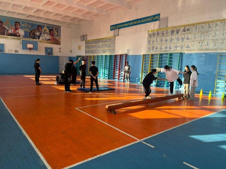 Ашық сабақ тақырыбы: "Топта гимнастика жаттығулар тізбегін құру және бағалау. (Акробатикалық жаттығулар жасау)" 9"А" сынып. Дене шынықтыру пән мұғалімі Карымсаков Е.К. Сабақты ұйындастыруы жоғарғы деңдейде болды, әр оқушыға нұсқаулық көрсетіп жаттығулардың дұрыс орындауын қабағалап отырды. Негізгі және қортынды бөлімі өте қызықты өтті.