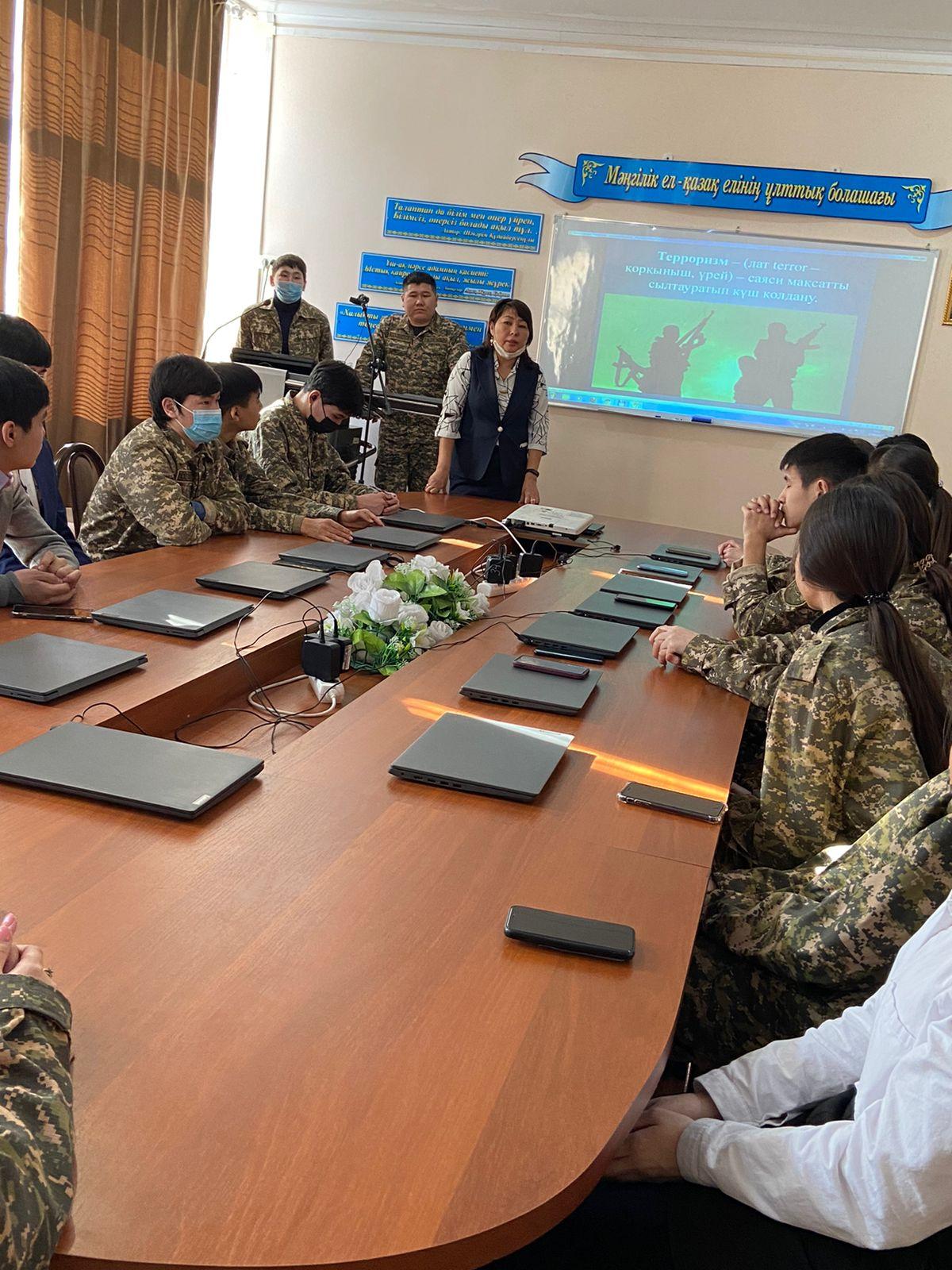17.02.2022 жылы 10 сынып оқушыларымен “Терроризм” тақырыбы бойынша АӘжТД пән мұғалімі Тұрсынқан А.М және Директордың тәрбие ісі жөніндегі орынбасары Жолдасханова Д.М мен балаларға терроризм кезіндегі іс-қимылдарын қалай іс- әрекет жасау керек екені жөнінде жиын өткізді.