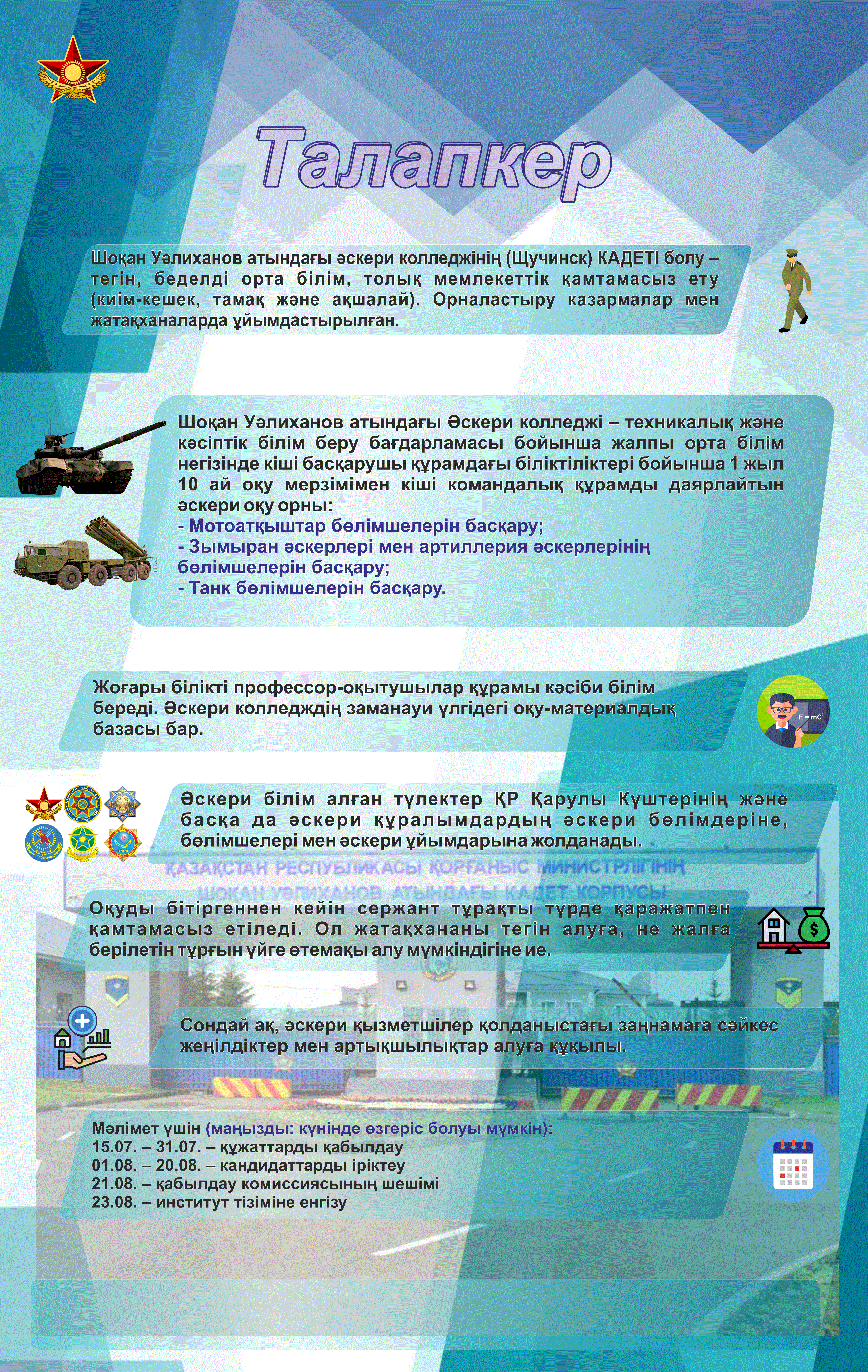 Средняя общеобразовательная школа №23 » Ақпарат » «Әскерге барып, Отан қорғағың келе ме? Сен онда бізге – Шоқан Уәлиханов атындағы Қорғаныс министрлігінің әскери колледжіне кел!