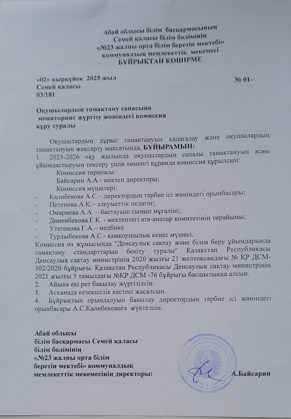 02 сентябрь 2025 0 1 2 3 4 5 Оқушылардың тамақтану сапасына мониторинг жүргізу жөніндегі комиссия құру туралы